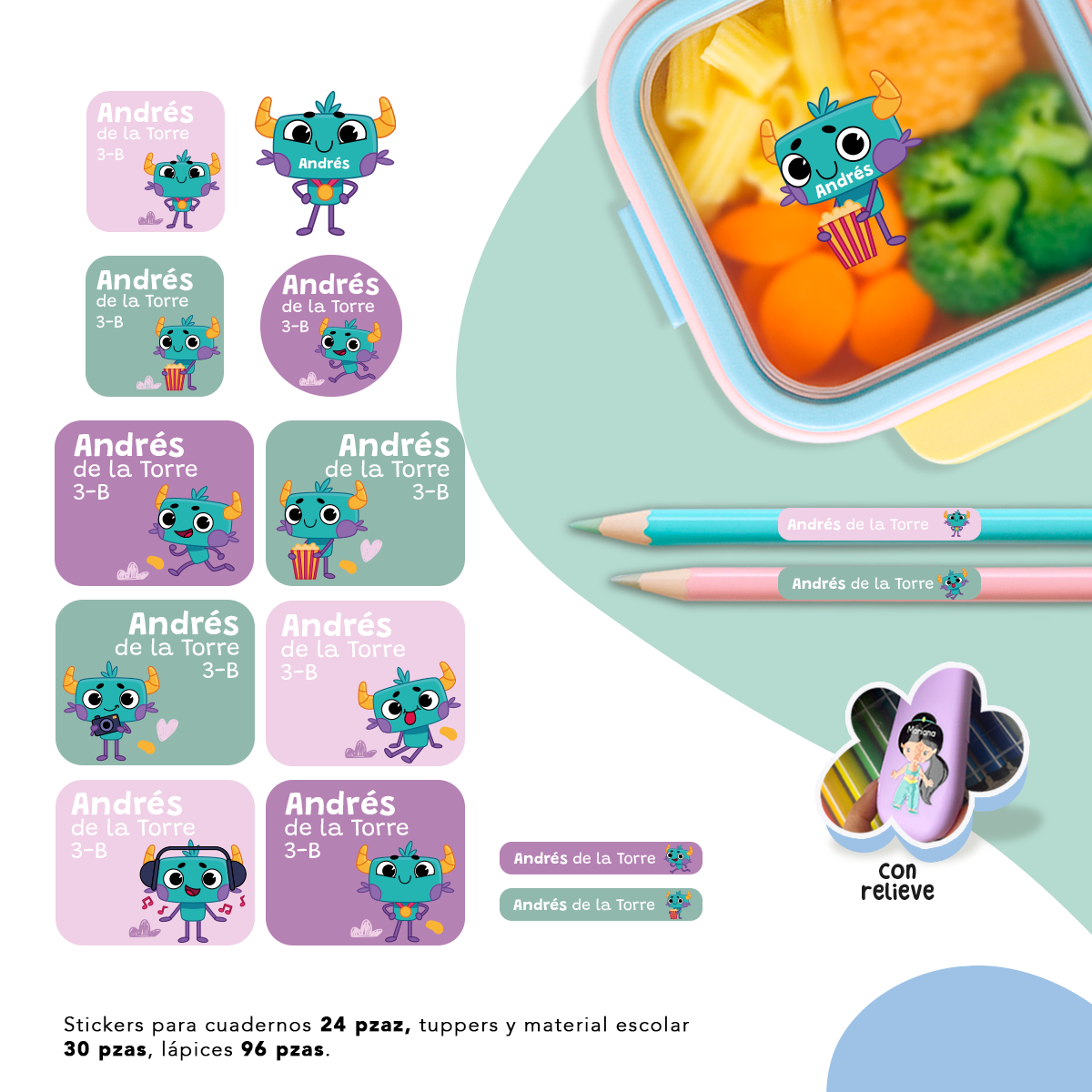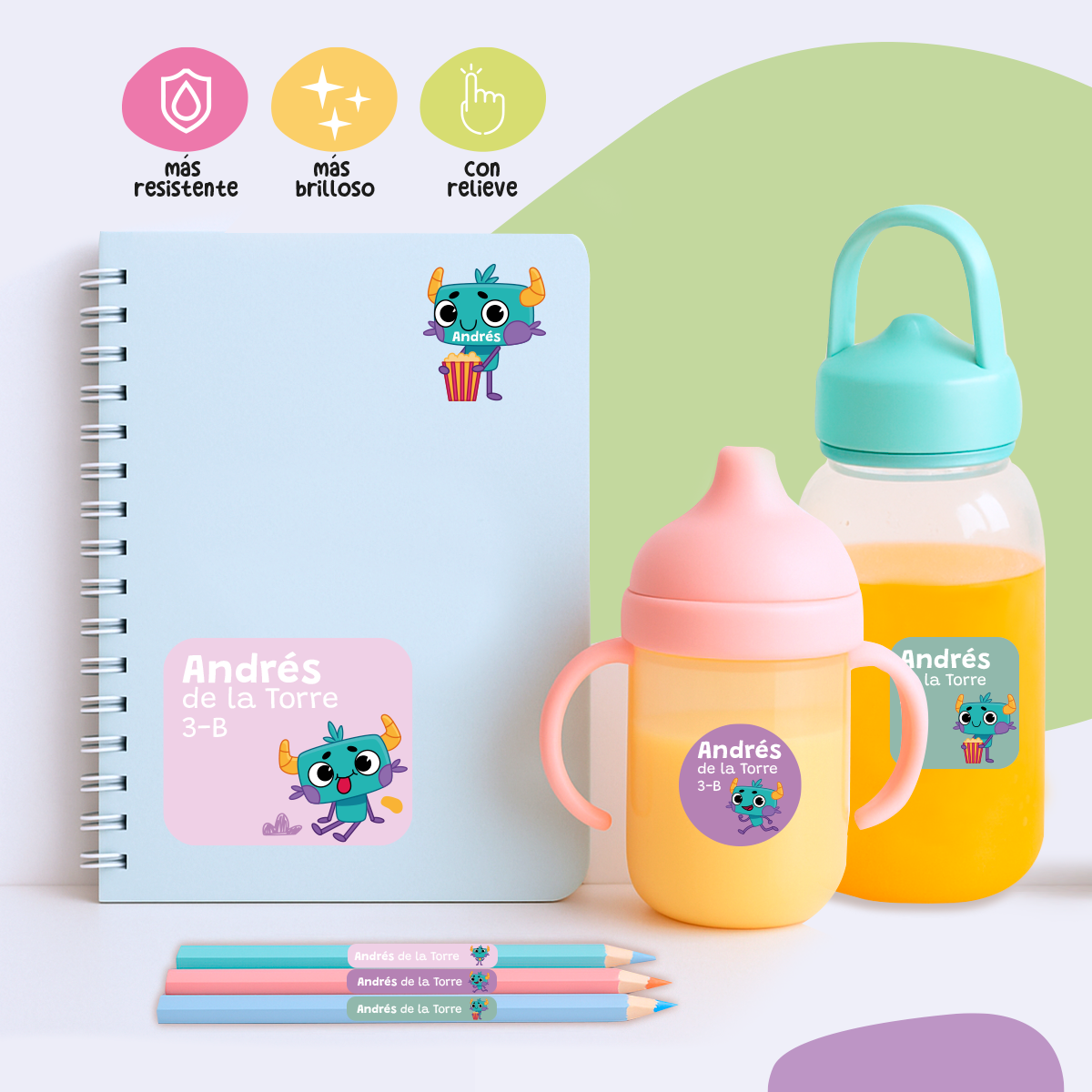 Identifica útiles, cuadernos, lápices y tuppers con stickers que saltan a la vista y que a tus peques les van a encantar.