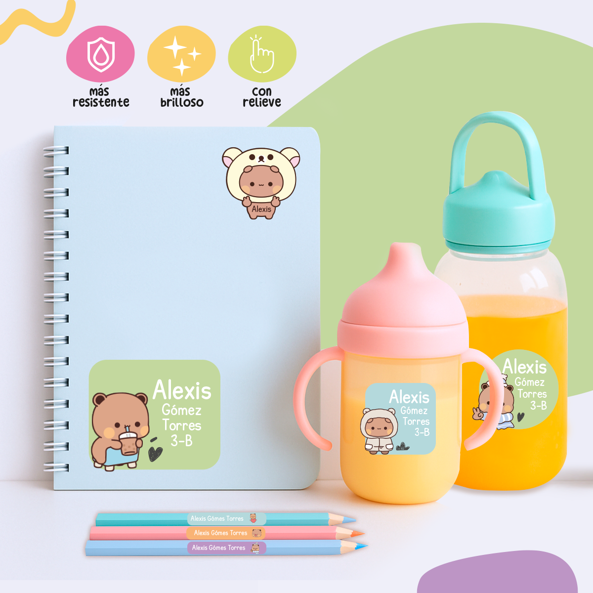 Identifica útiles, cuadernos, lápices y tuppers con stickers que saltan a la vista y que a tus peques les van a encantar.