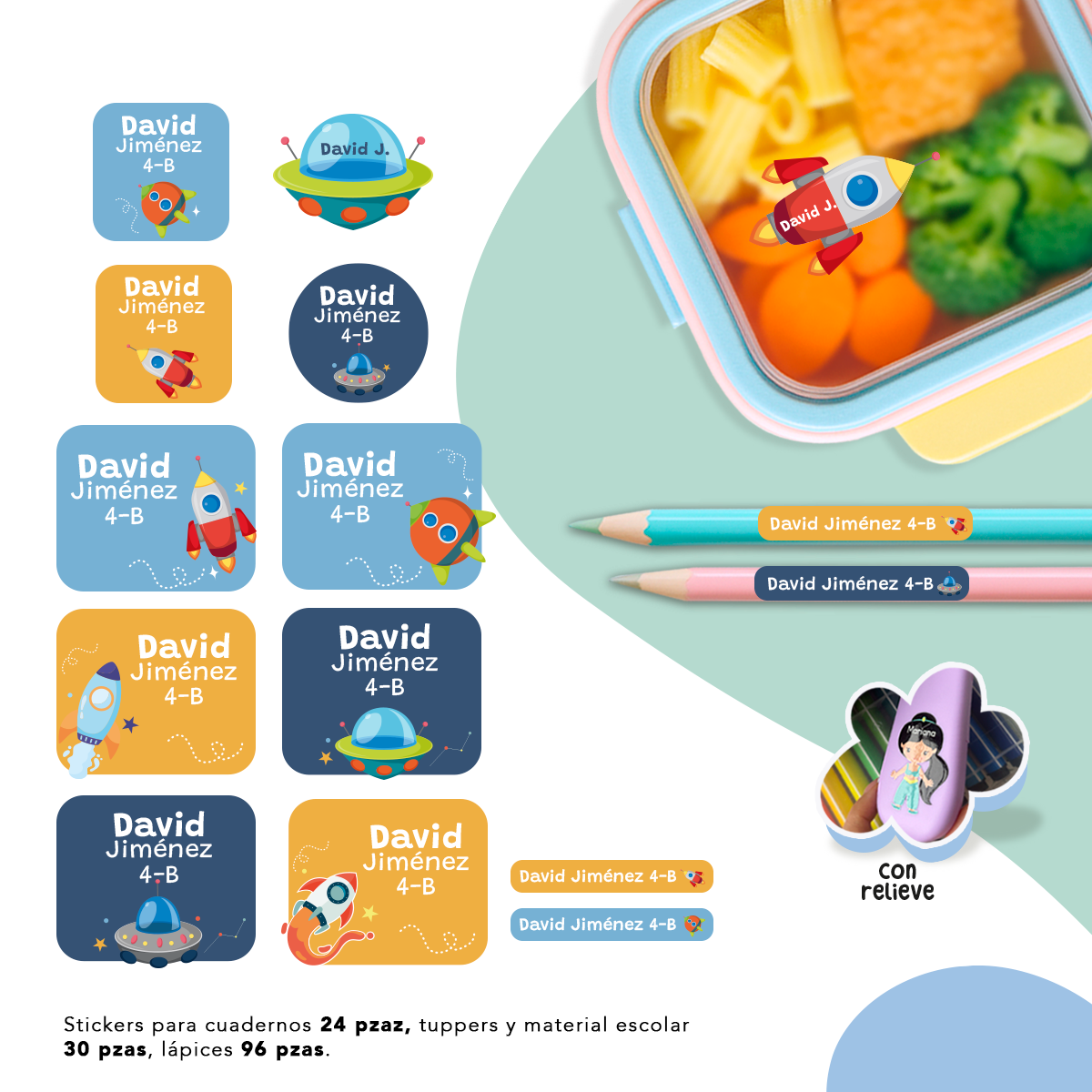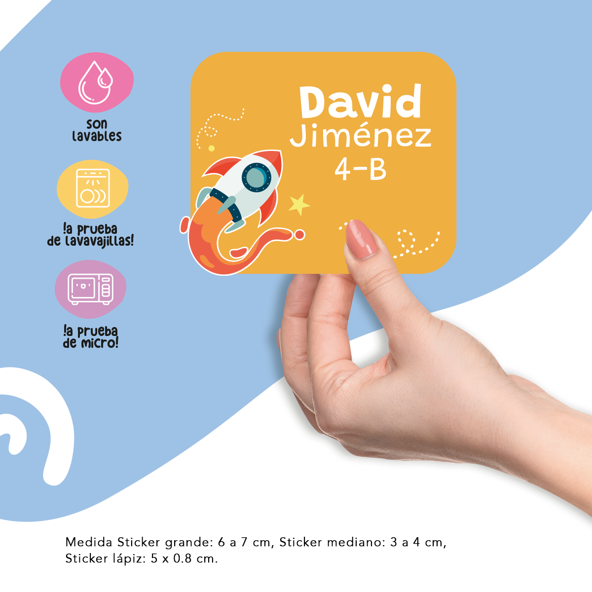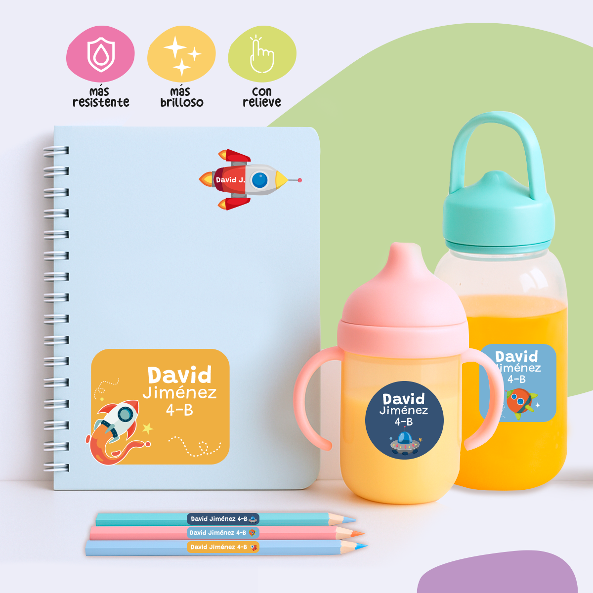 Identifica útiles, cuadernos, lápices y tuppers con stickers que saltan a la vista y que a tus peques les van a encantar.