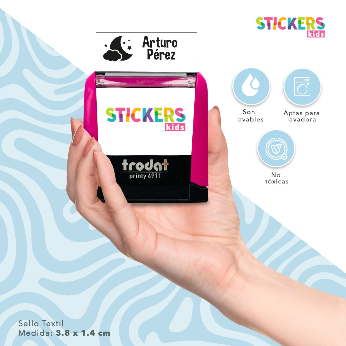 Nuestro sello textil incluye un cartucho de Tinta textil en color negro (no tóxica.)